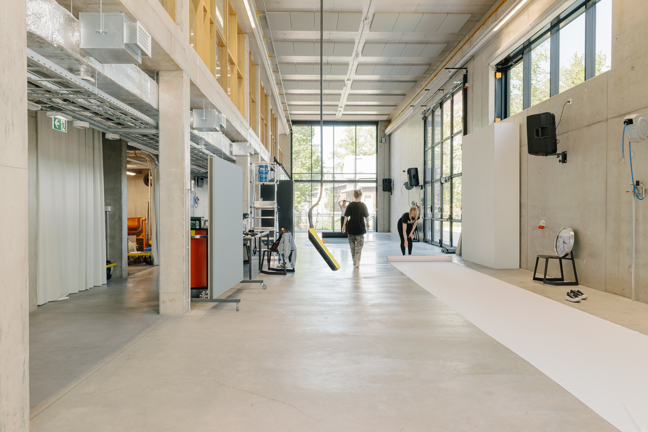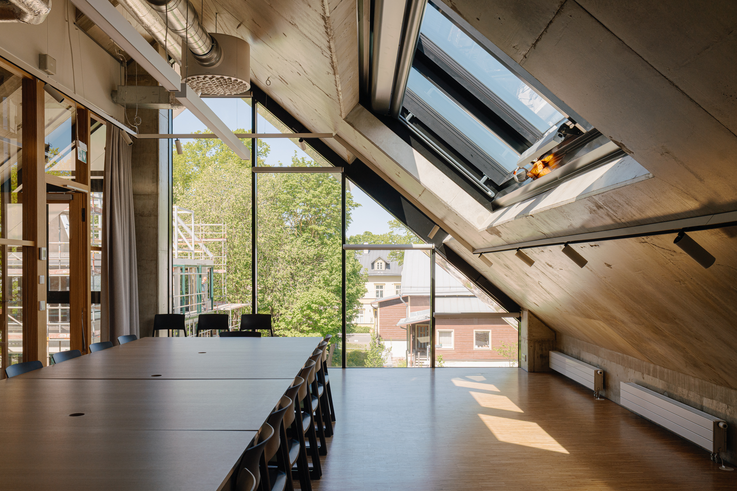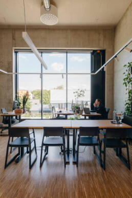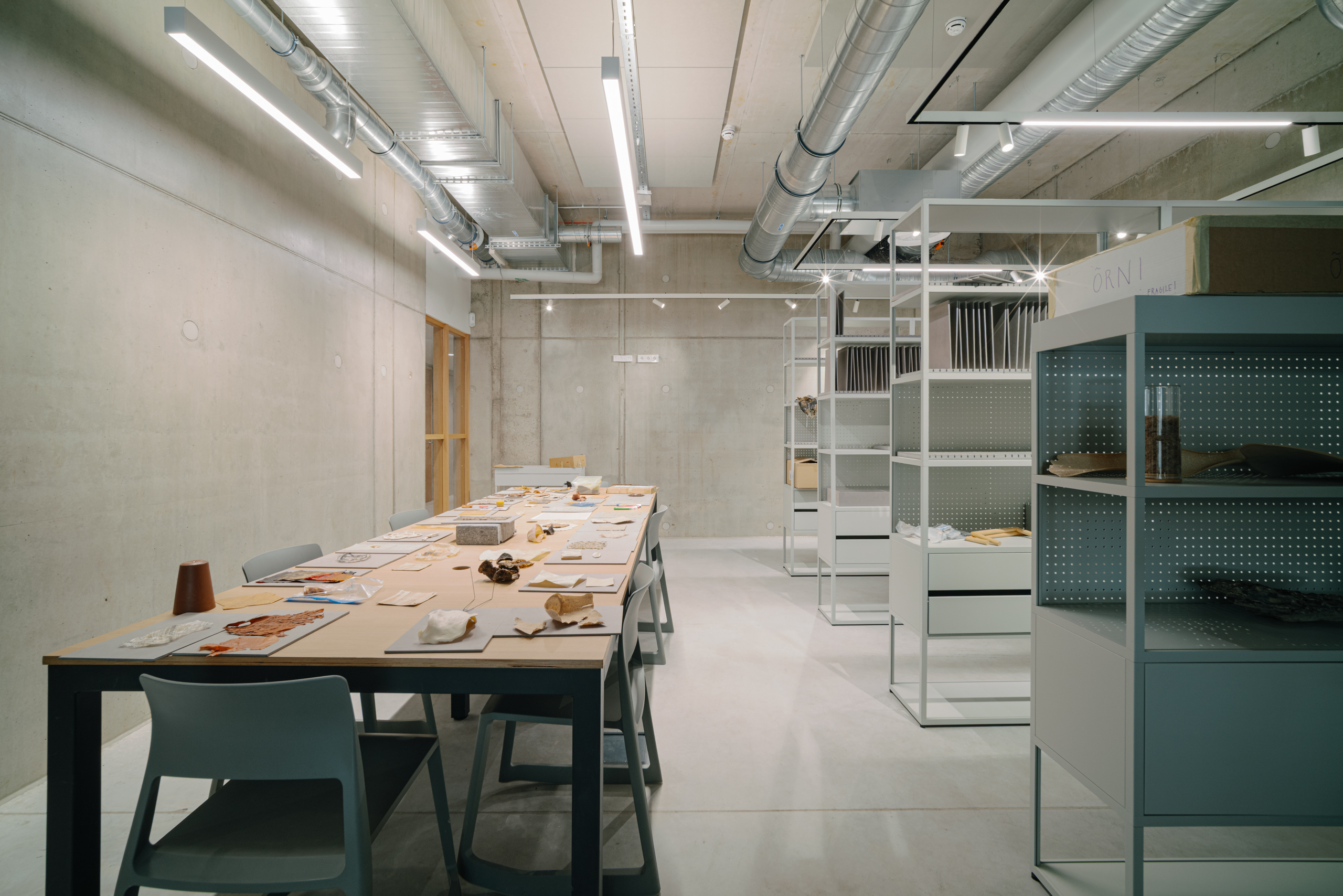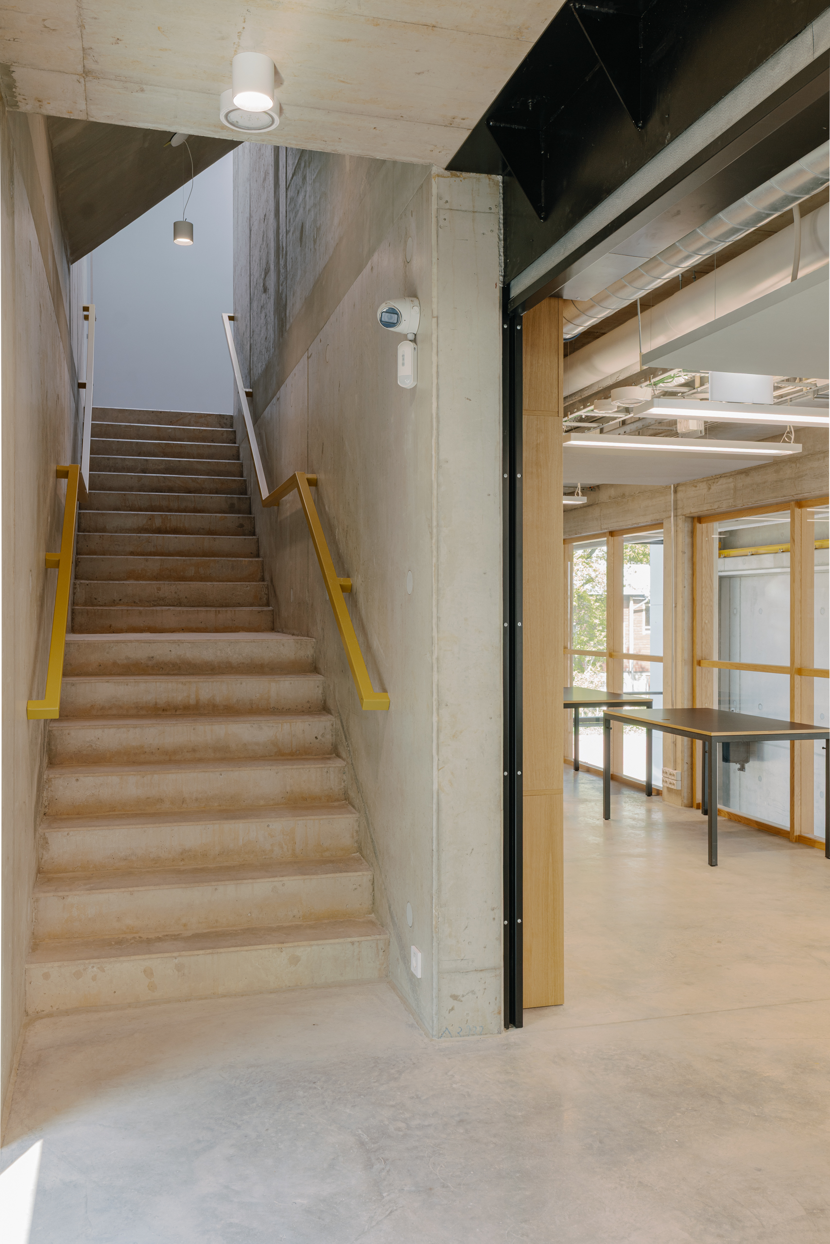 The starting point for the interior design of the Estonian Academy of Arts studio building was deliberately modest. We wanted to create a space that does not compete with creativity, but rather gives it the freedom to emerge — like a neutral canvas for young artists. Therefore, we left as much of the structural concrete exposed as possible and complemented it with natural wood, while orange and yellow details add pop of color here and there.