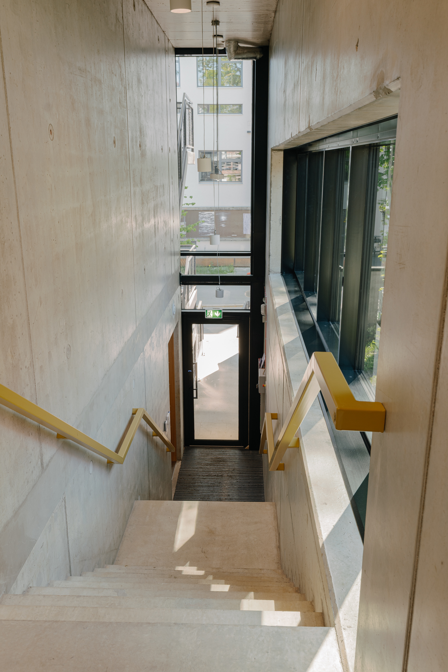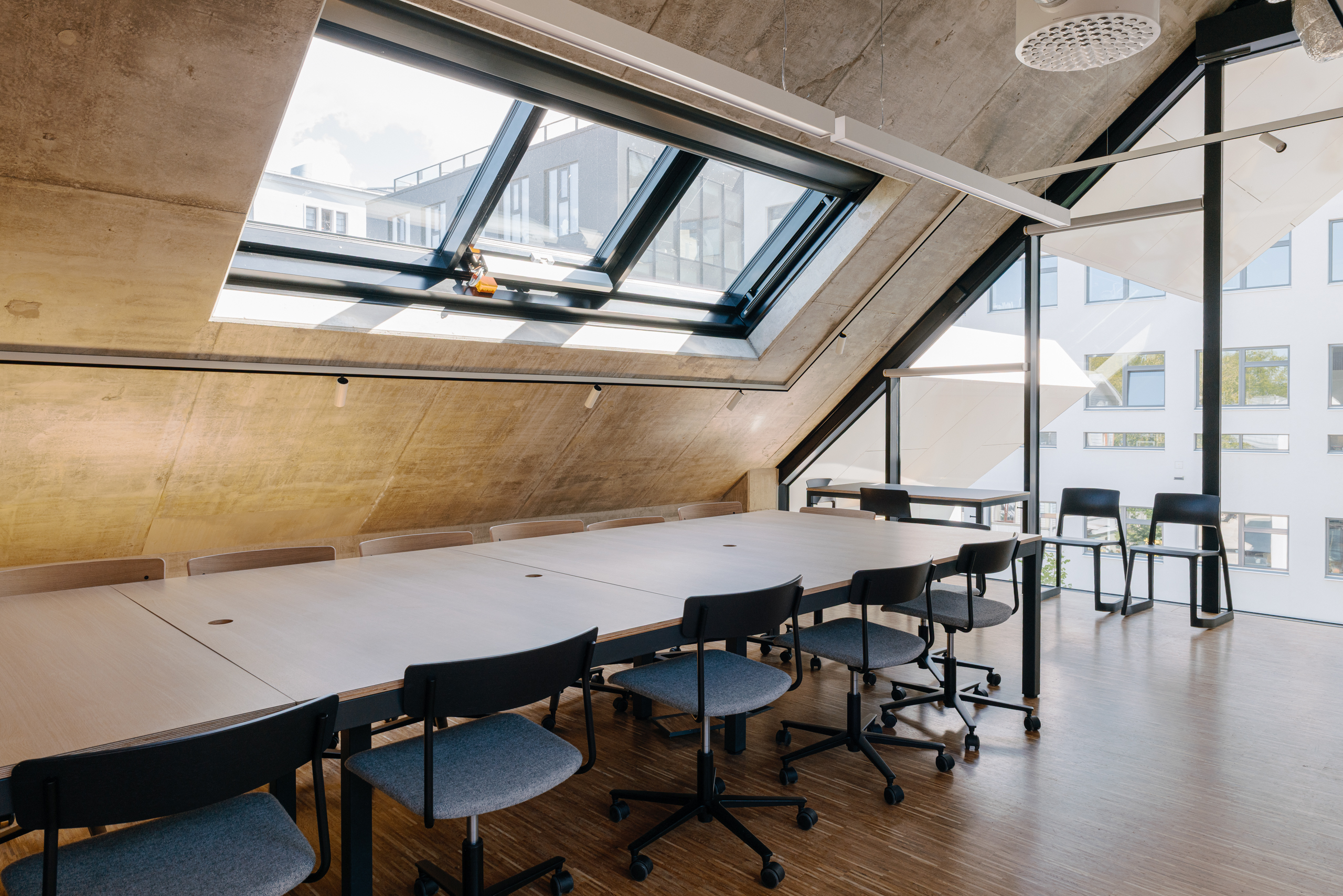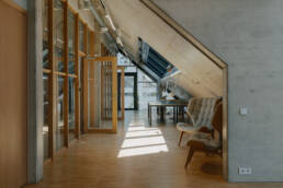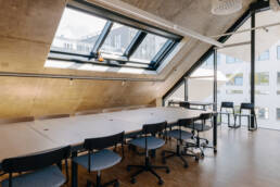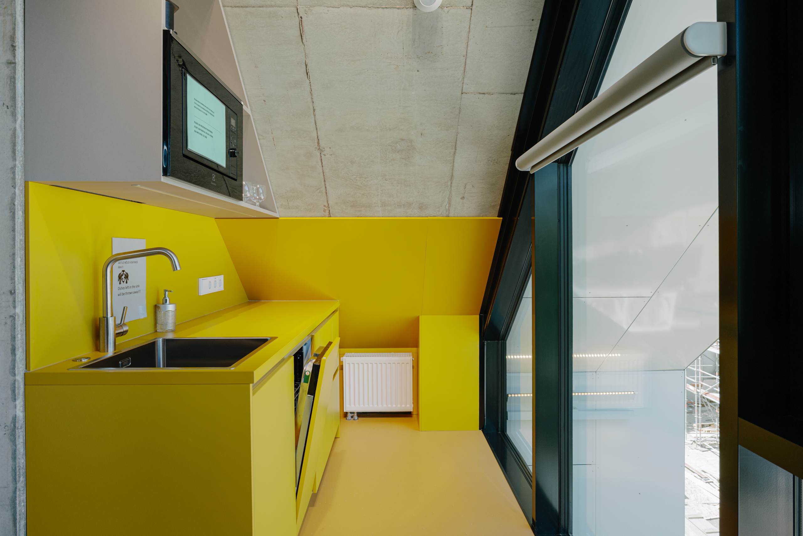 The starting point for the interior design of the Estonian Academy of Arts studio building was deliberately modest. We wanted to create a space that does not compete with creativity, but rather gives it the freedom to emerge — like a neutral canvas for young artists. Therefore, we left as much of the structural concrete exposed as possible and complemented it with natural wood, while orange and yellow details add pop of color here and there.